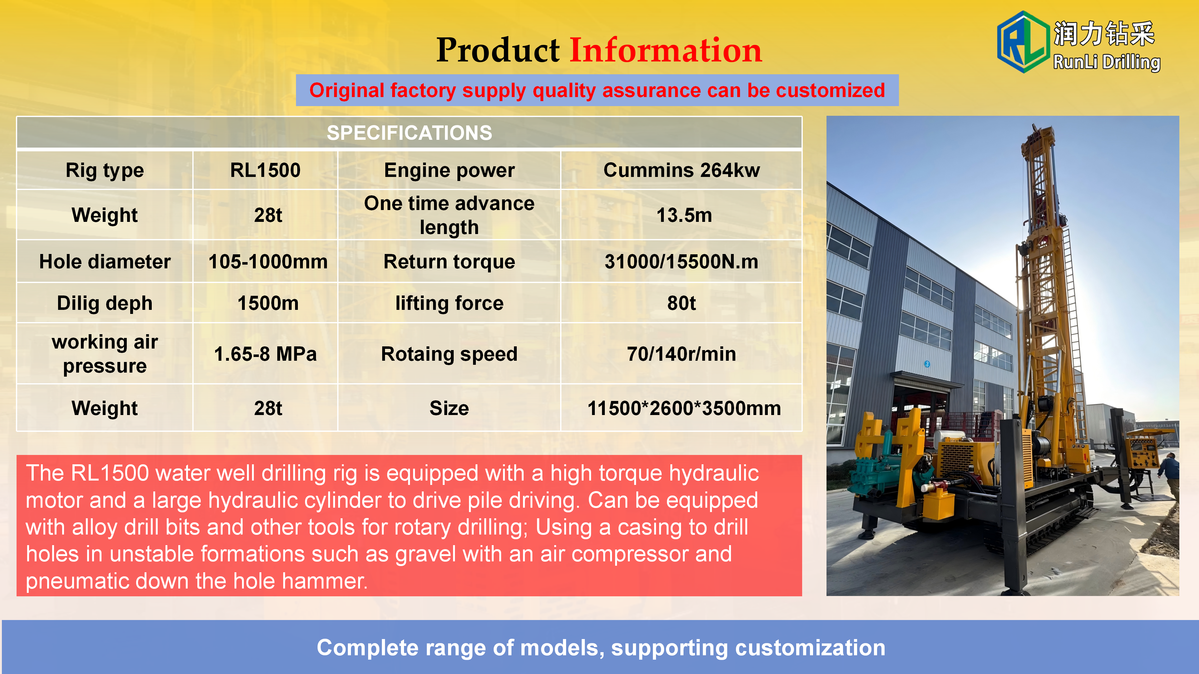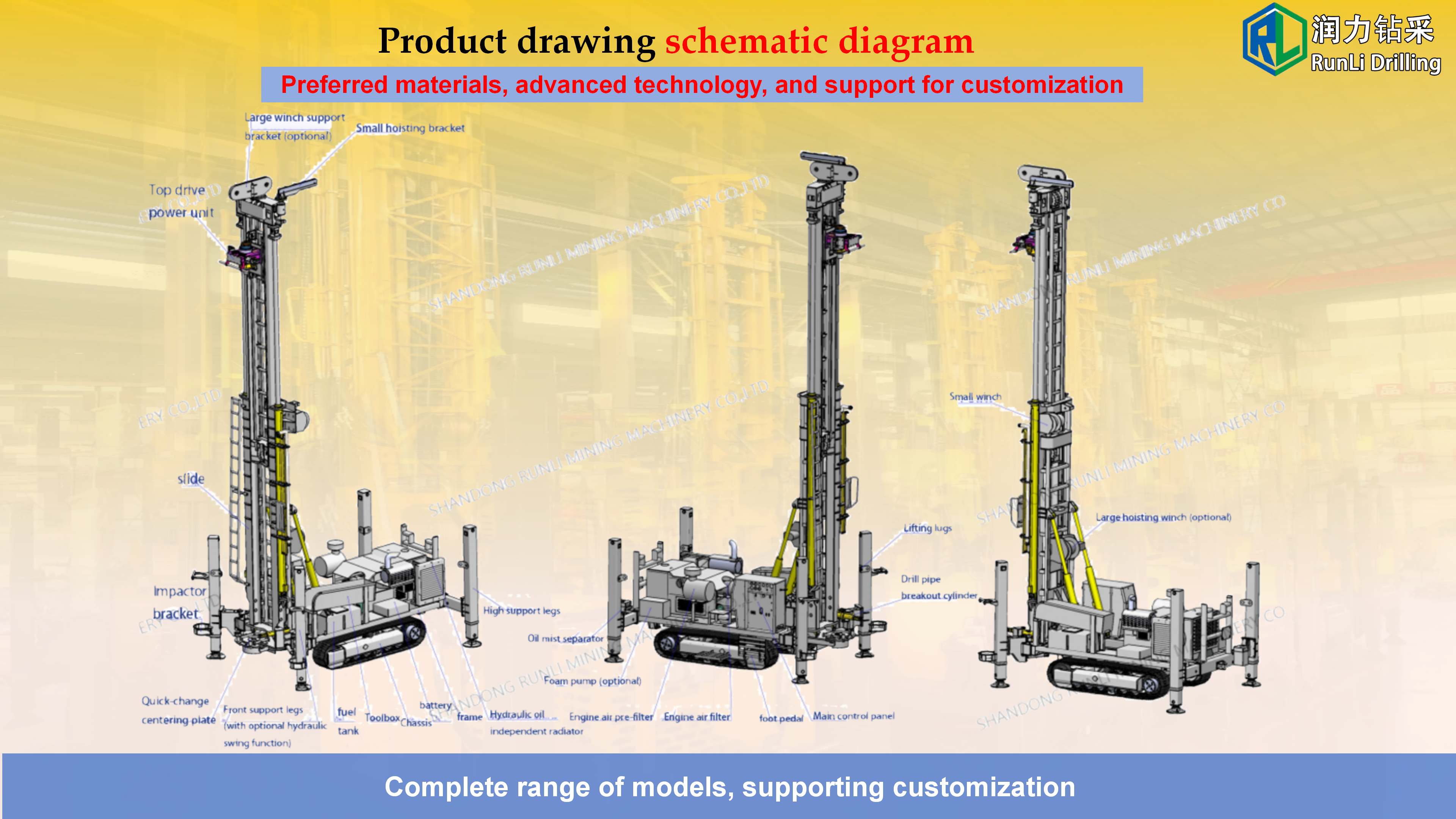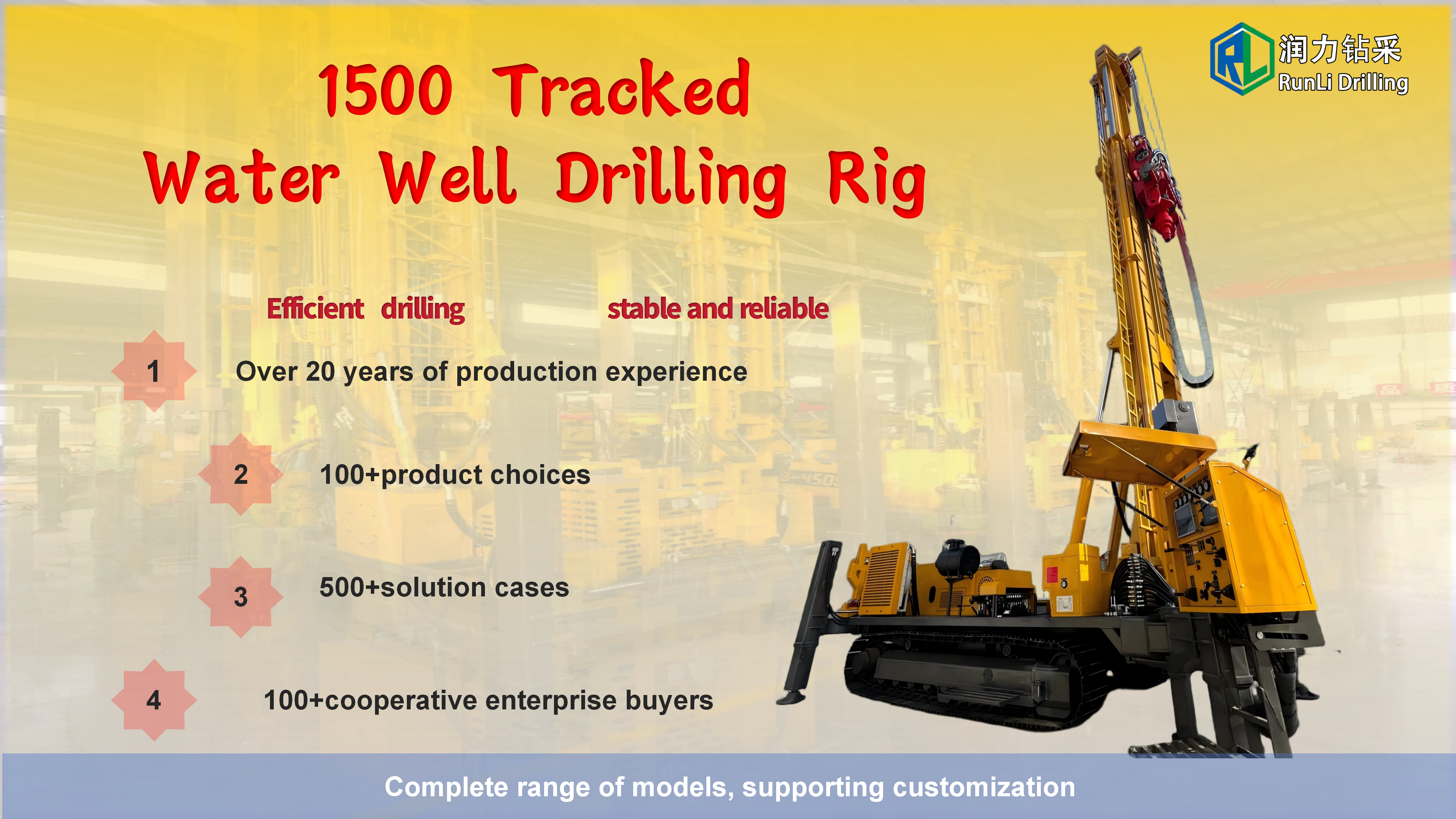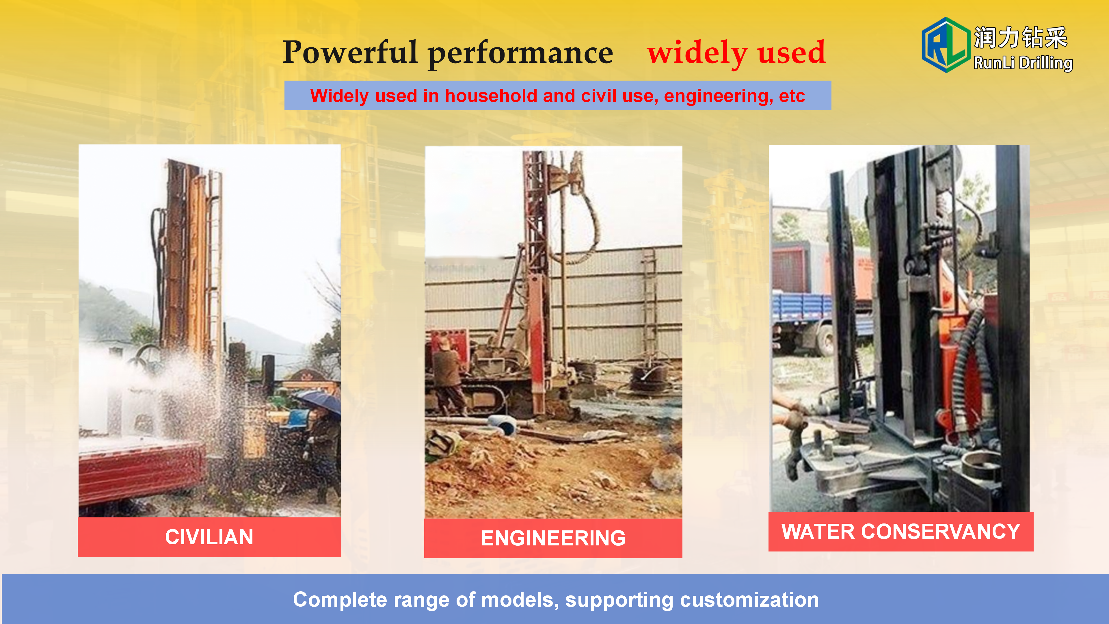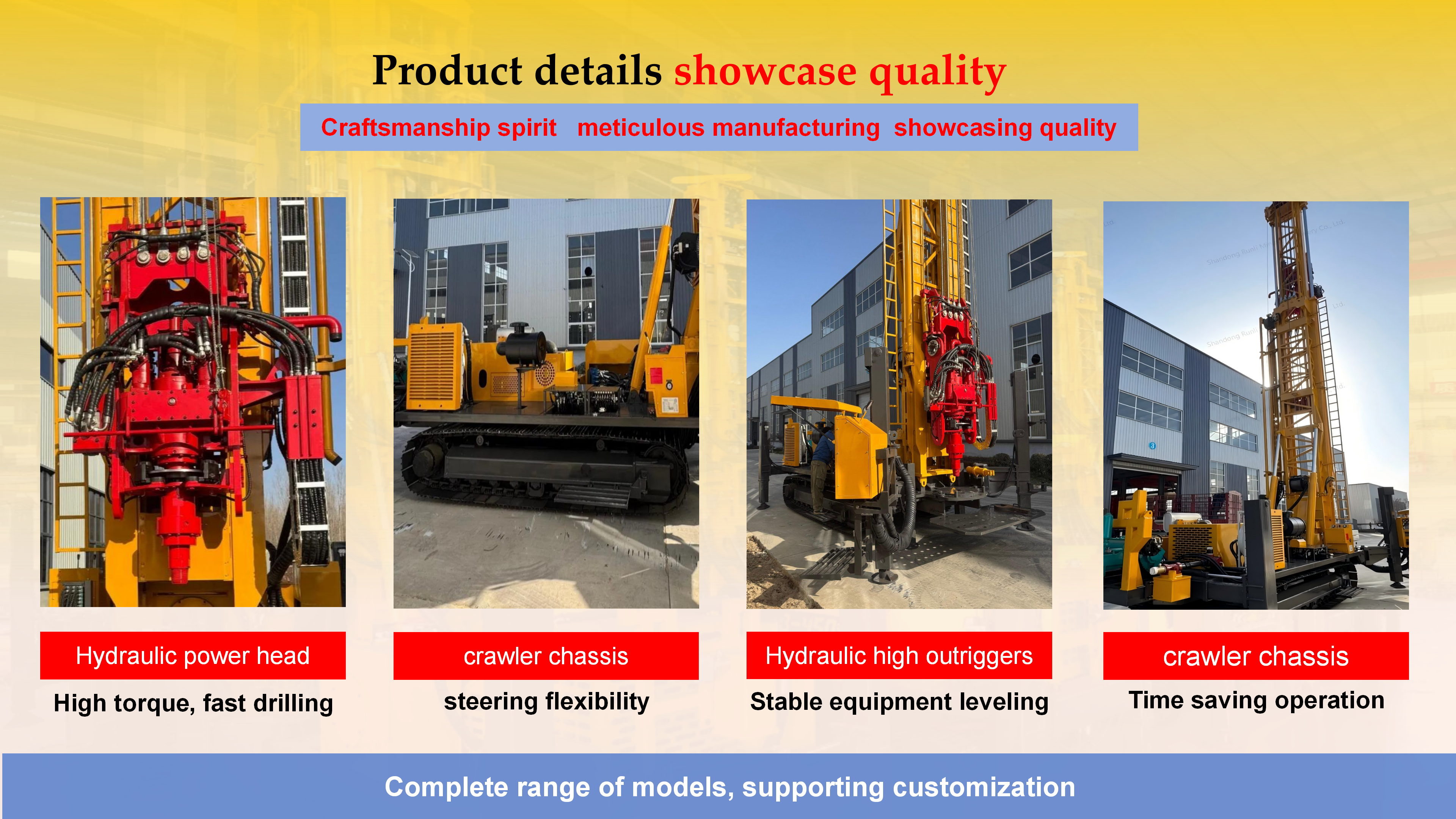 The equipment has remarkable characteristics: high degree of mechanization, fast hole forming efficiency, drilling depth up to hundreds of meters, widely used in agricultural irrigation, industrial water and other fields. The crawler design makes it flexible to move, especially suitable for dispersed well placement in the field, and is an efficient main equipment for modern well construction.Its core is composed of power, drilling, mud circulation and control systems: the power system is mostly diesel engines, which provide operating power; The drilling system breaks the rock by means of drill pipe, drill bit rotation or percussion; The mud circulation system uses a mud pump to deliver flushing fluid, cool the drill bit and carry cuttings; The control system precisely adjusts the parameters.