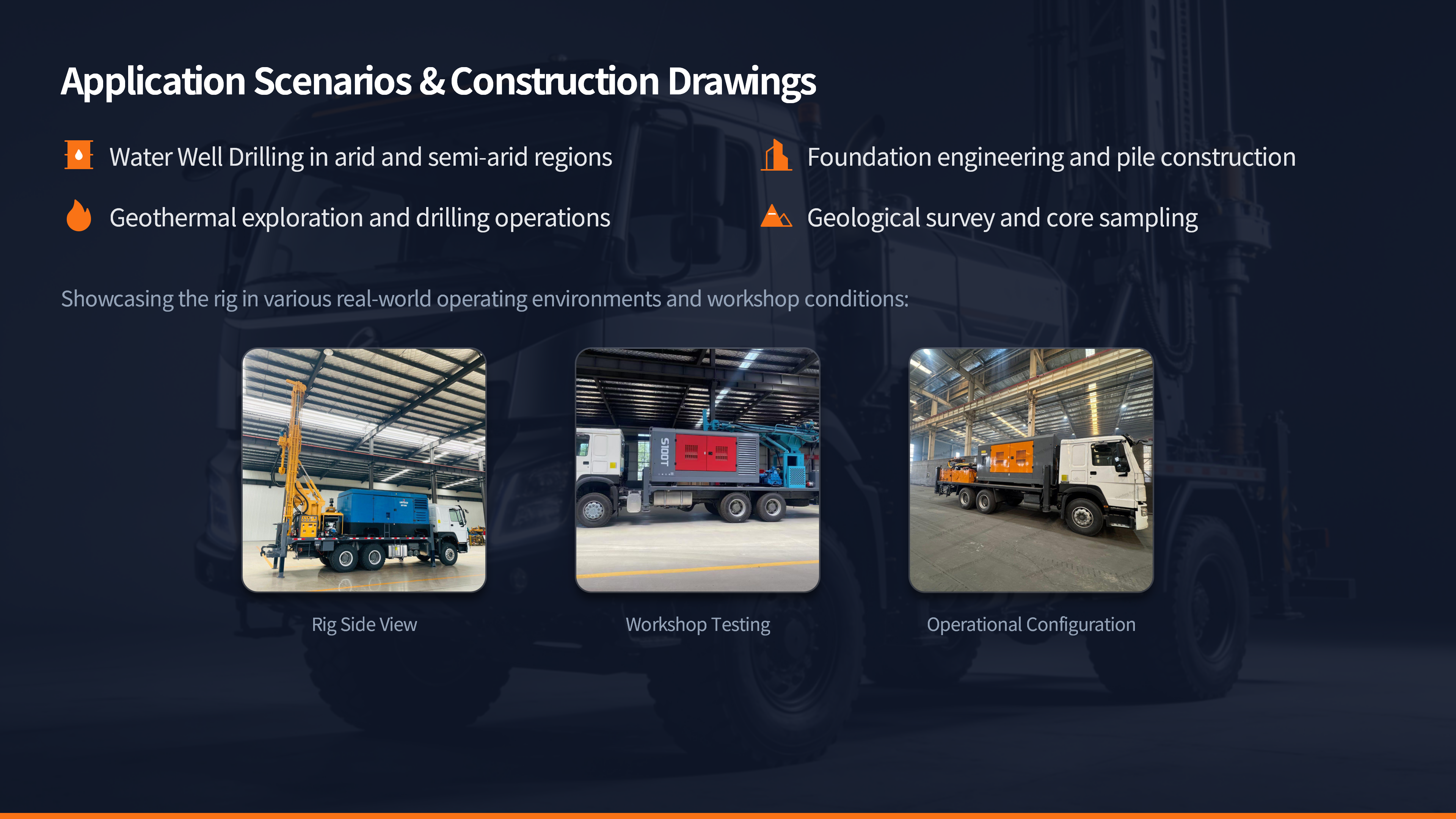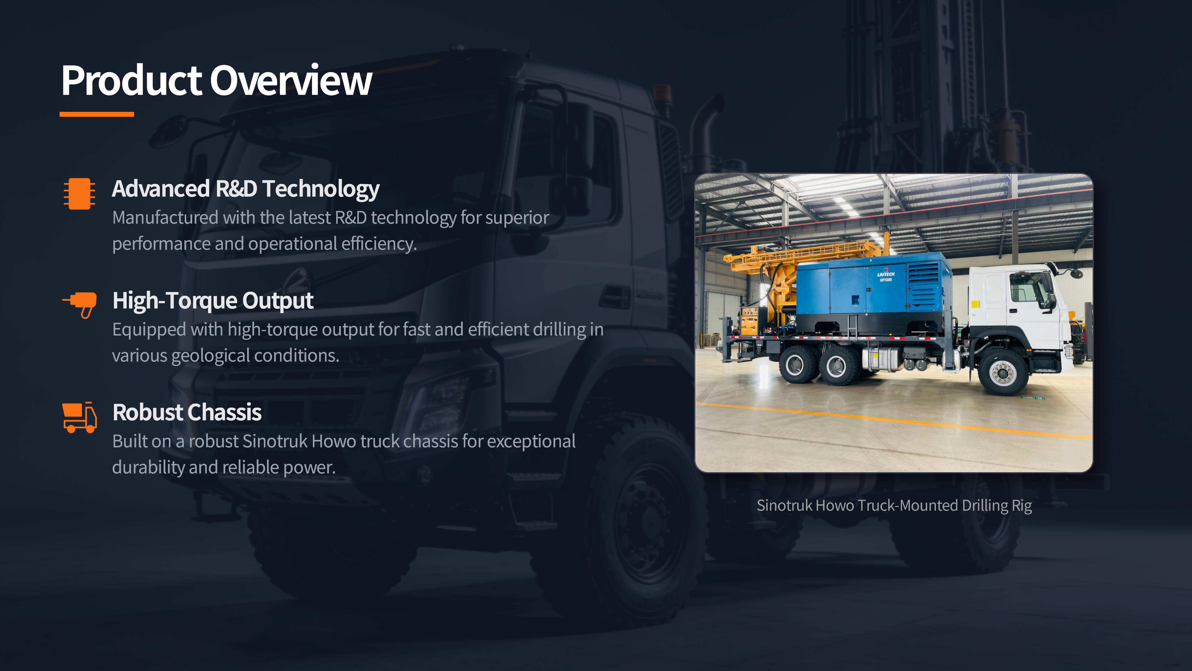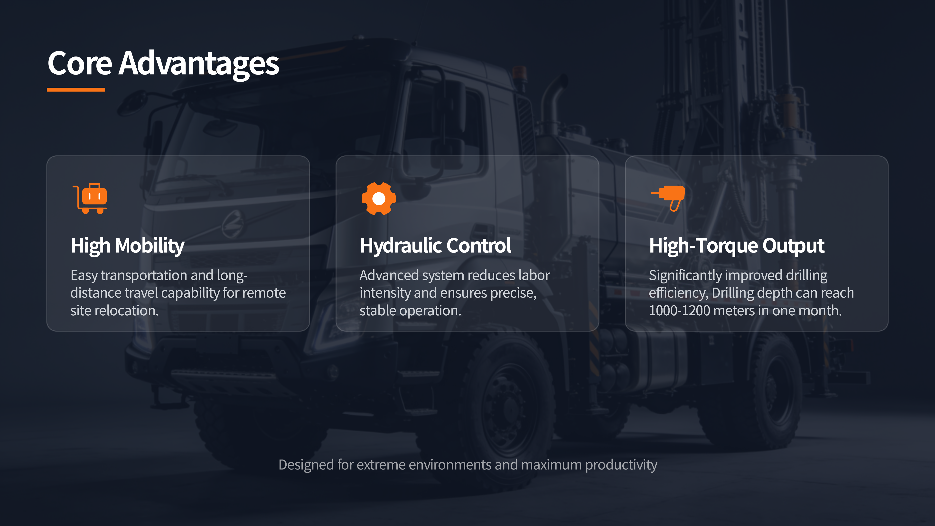 A vehicle-mounted drilling rig is an integrated drilling device mounted on a heavy-duty truck or specialized chassis, enabling rapid relocation. The drilling rig, water pump, or compressor, and other equipment are mounted on the vehicle chassis, providing mobility and flexibility. This modern drilling rig combines efficient drilling, maneuverability, and intelligent control. It is widely used in geological exploration, hydrological drilling, coalbed methane development, engineering surveys, and geothermal well construction. It offers advantages such as maneuverability, efficient drilling capabilities, ease of operation, safety, versatility, and adaptability to complex geological conditions.