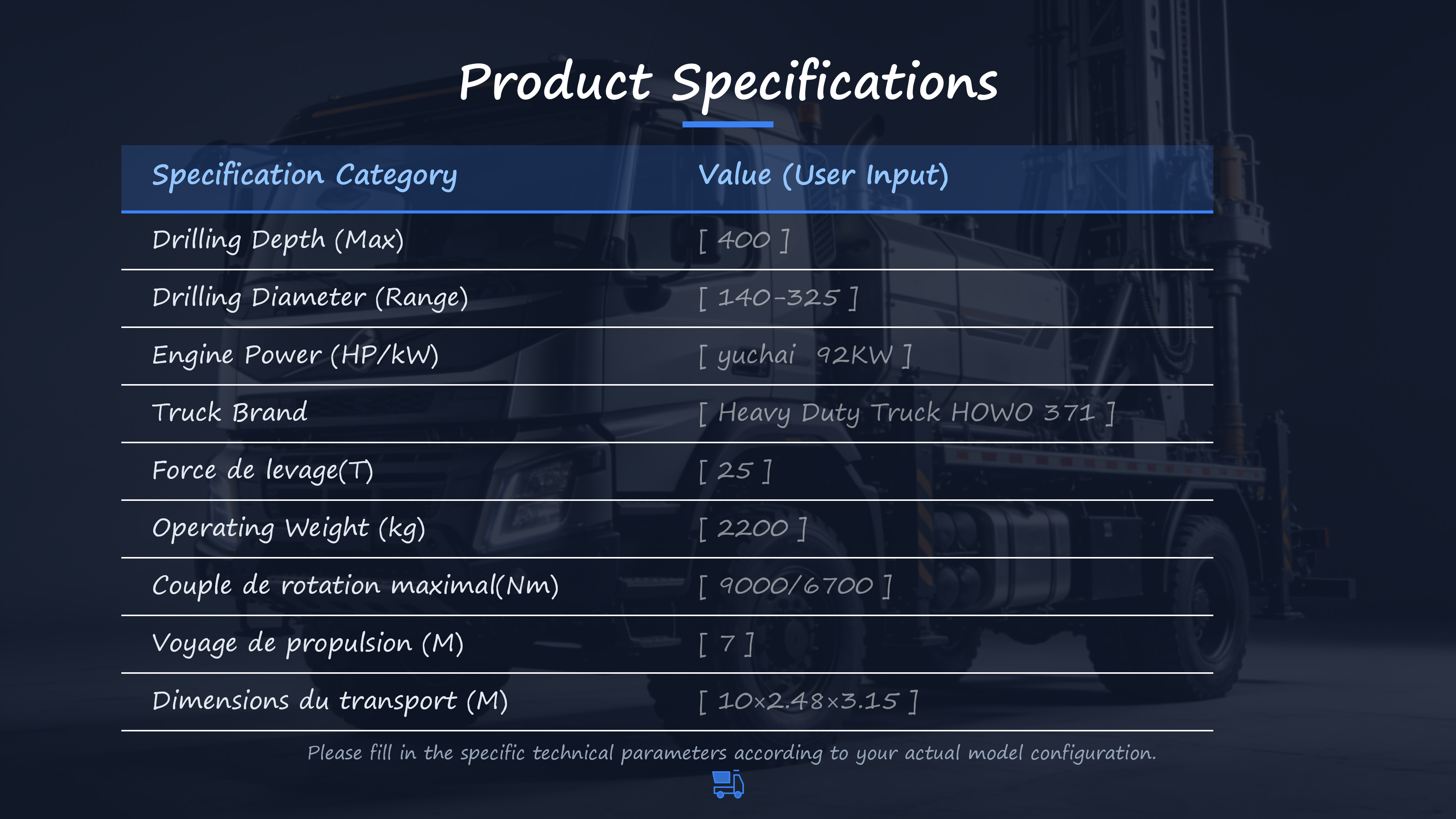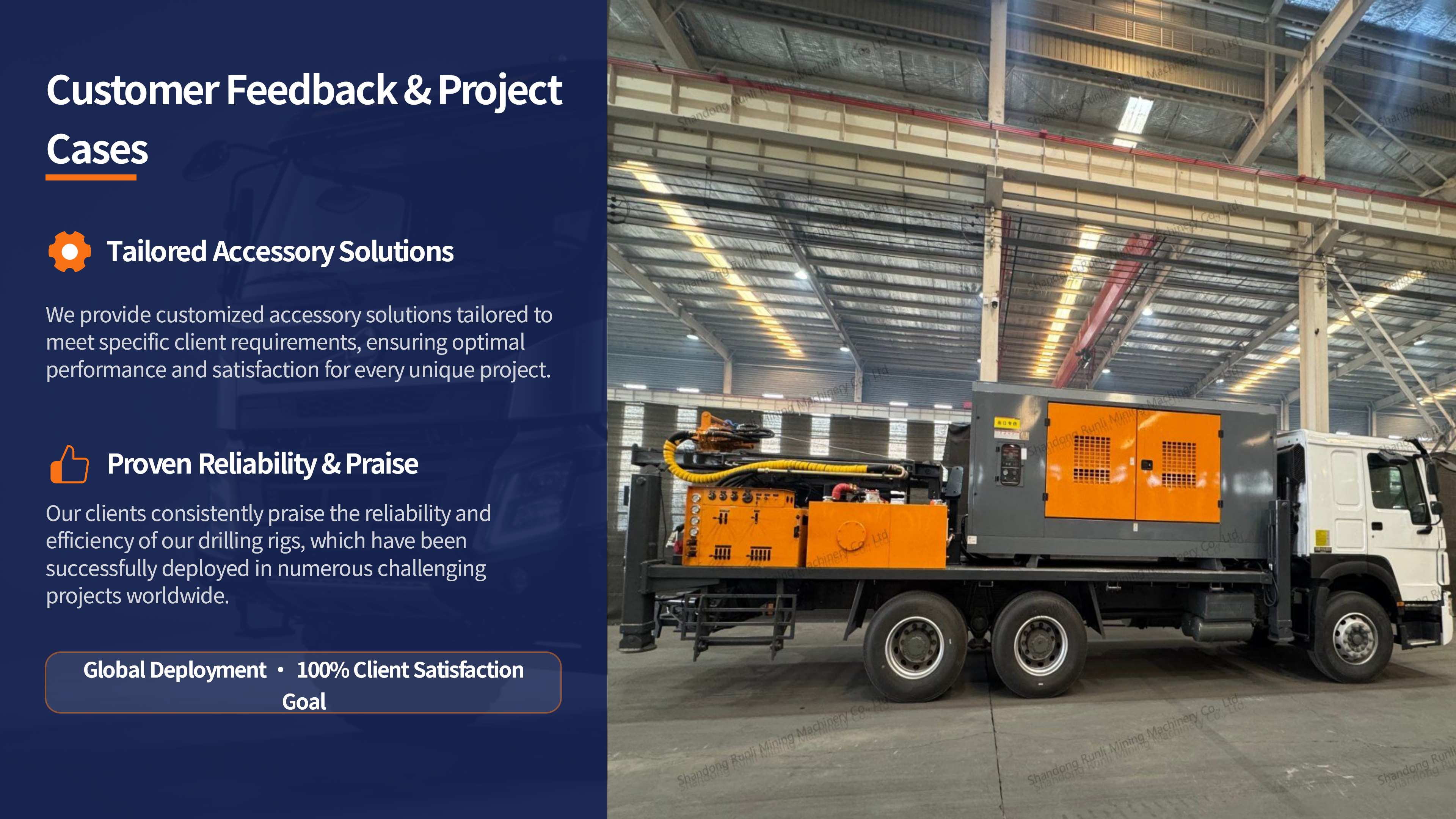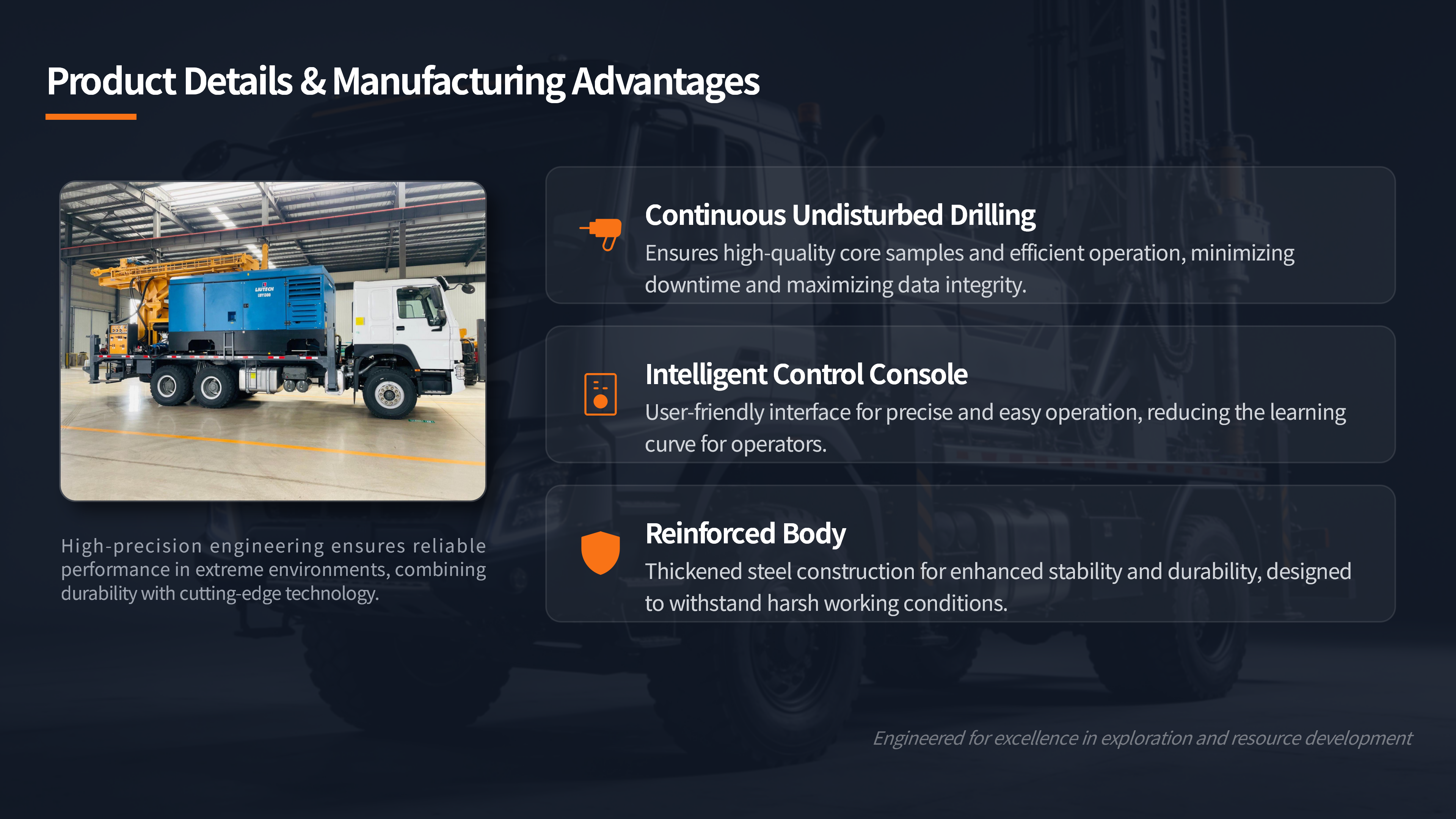 A vehicle-mounted drilling rig is an integrated drilling device mounted on a heavy-duty truck or specialized chassis, enabling rapid relocation. The drilling rig, water pump, or compressor, and other equipment are mounted on the vehicle chassis, providing mobility and flexibility. This modern drilling rig combines efficient drilling, maneuverability, and intelligent control. It is widely used in geological exploration, hydrological drilling, coalbed methane development, engineering surveys, and geothermal well construction. It offers advantages such as maneuverability, efficient drilling capabilities, ease of operation, safety, versatility, and adaptability to complex geological conditions.